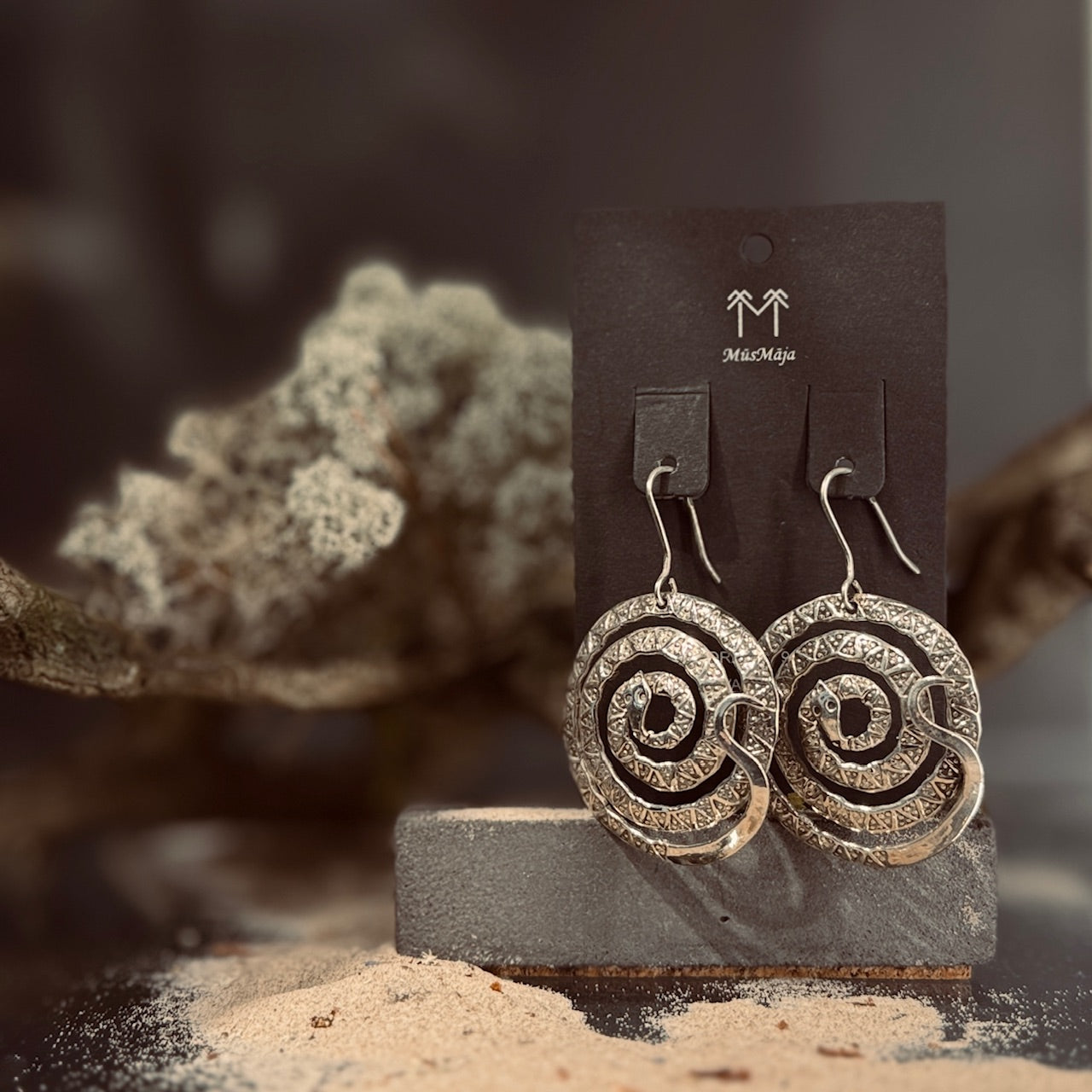 Spirālveida vijums pastiprina simbolisko nozīmi - tas attēlo mūžības ciklu, nepārtrauktu attīstību un kustību. Sudraba auskaru smalkie raksti un rūpīgā apdare atspoguļo amatnieka roku darbu un senatnes iedvesmotu estētiku.