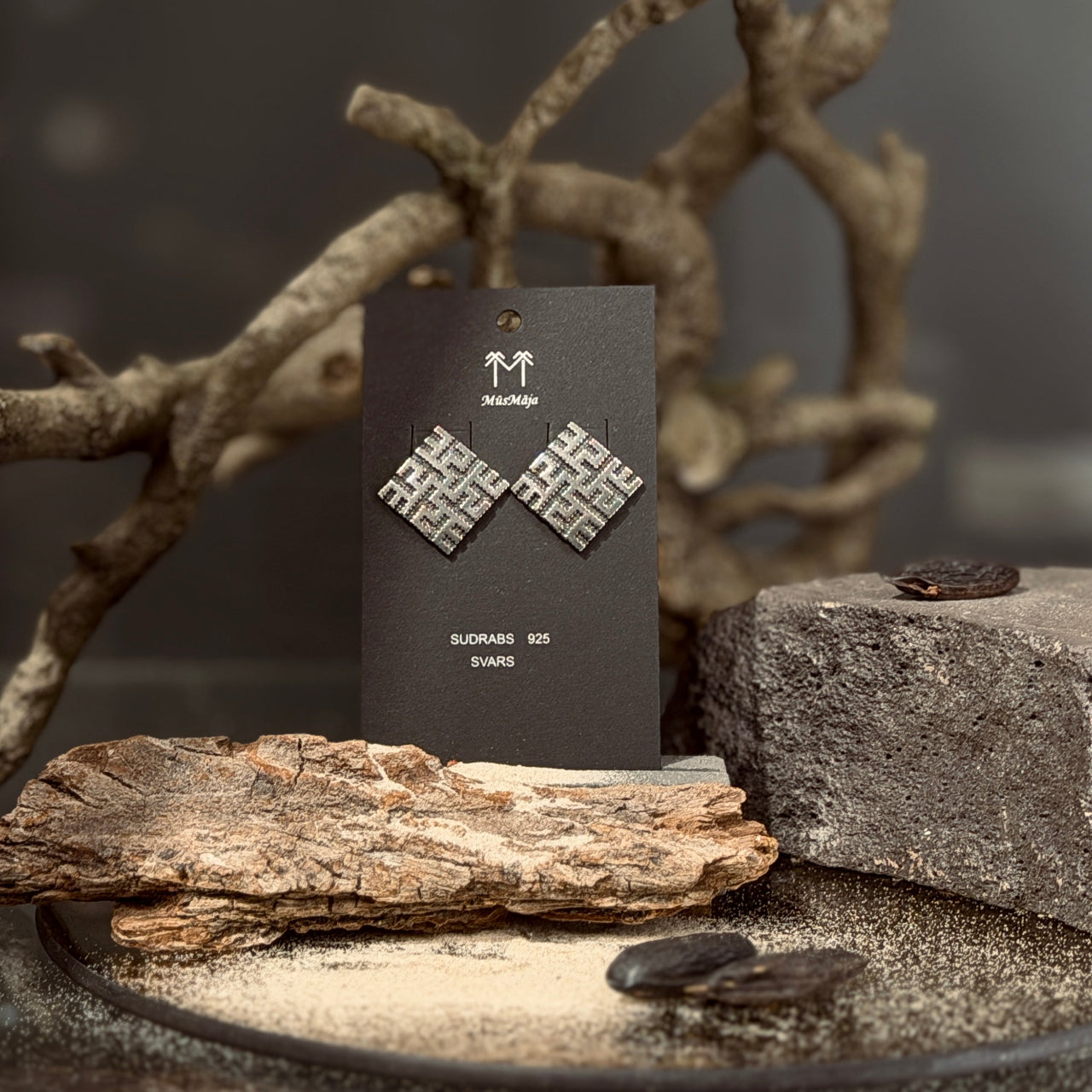 Auskari viedoti no 925 proves sudraba, rūpīgi izstrādātā ģeometriskā formā. Auskaru smalkā faktūra piešķir rakstam dziļumu un mūsdienīgu eleganci, saglabājot zīmes seno kodu. Sudraba auskaru kvadrātiskā forma ar diagonālu novietojumu rada dinamisku, bet līdzsvarotu tēlu.