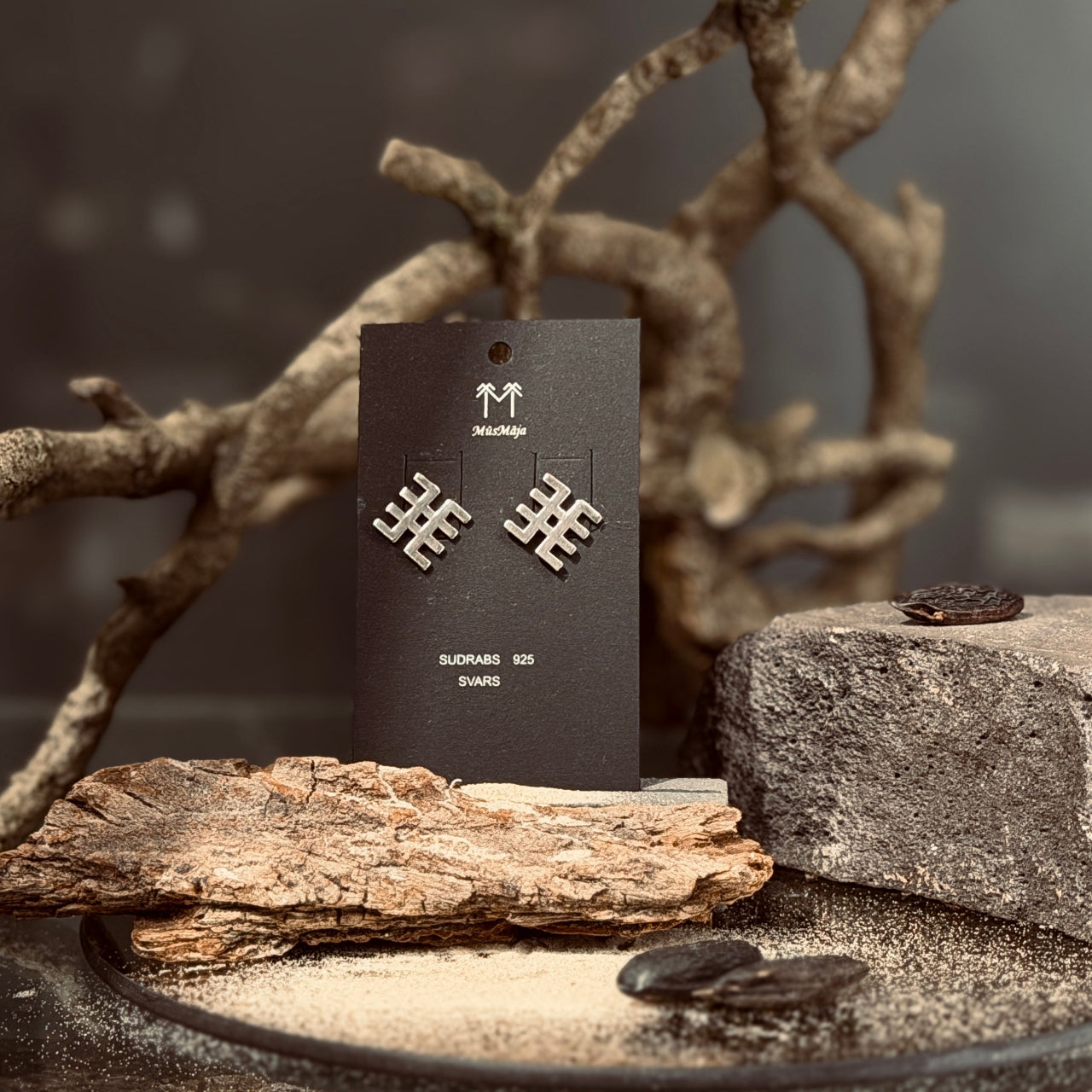 Auskari veidoti no 925 proves sudraba, tīrā un izteiksmīgā formā. Zīmes dinamiskās līnijas rada kustības sajūtu - it kā simbols pulsētu līdzi valkātājas enerģijai. Auskaru kvadrāta kompozīcija piešķir mūsdienīgu raksturu, saglabājot senās zīmes būtību.