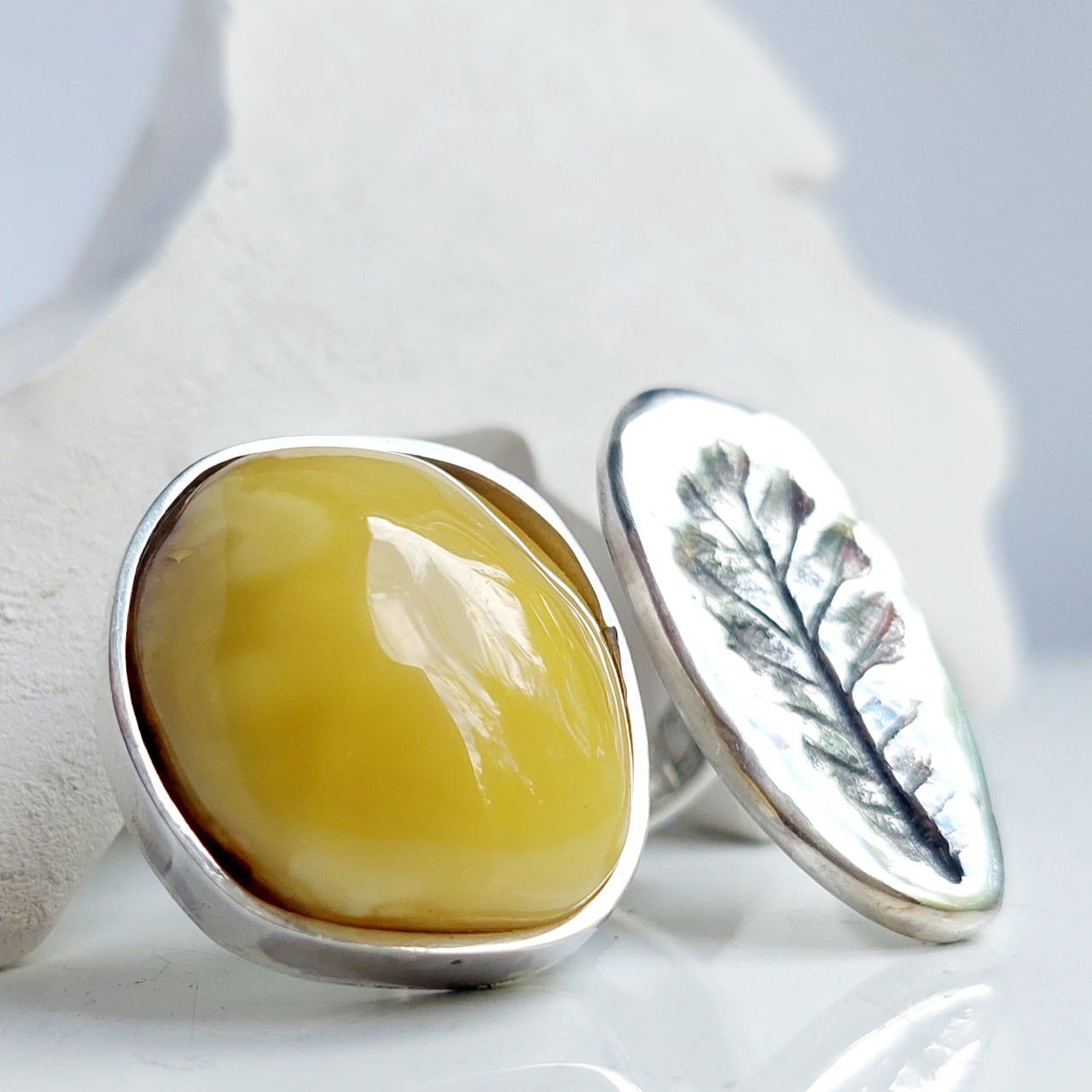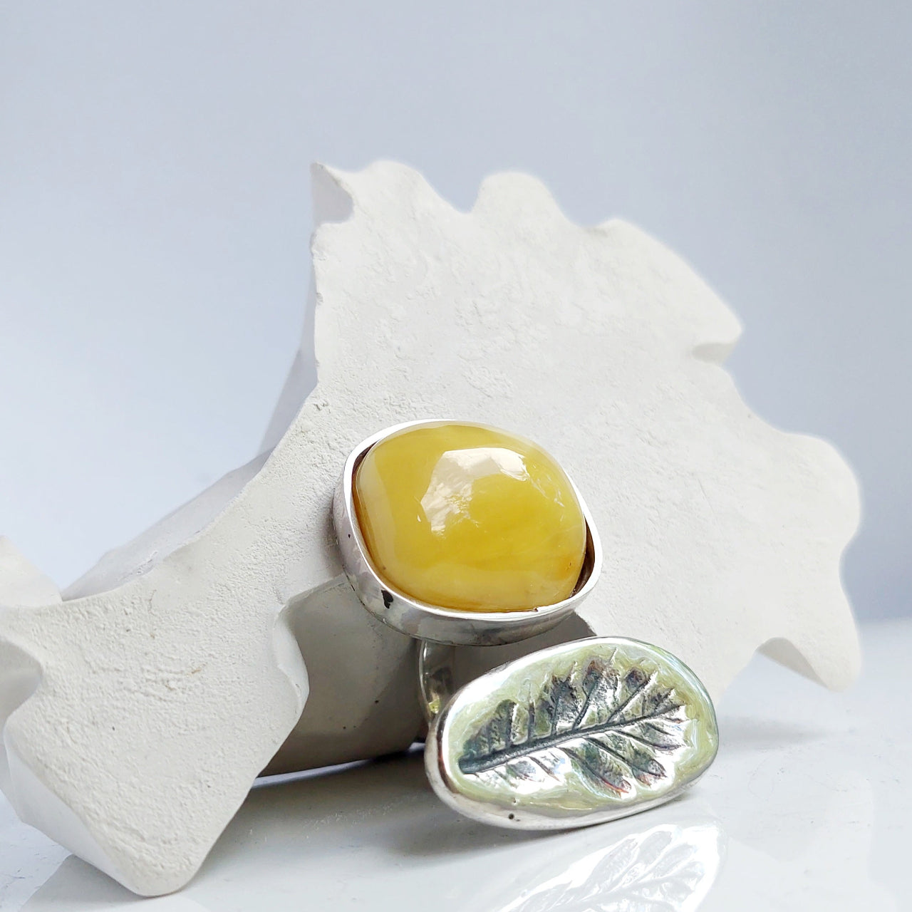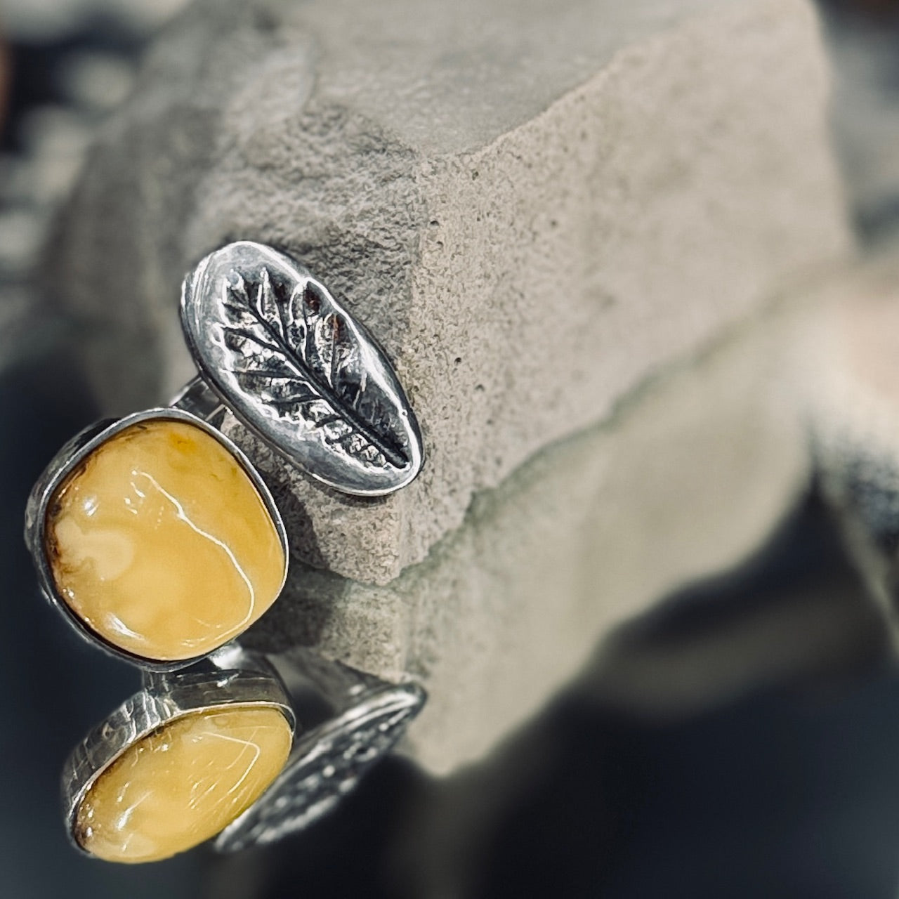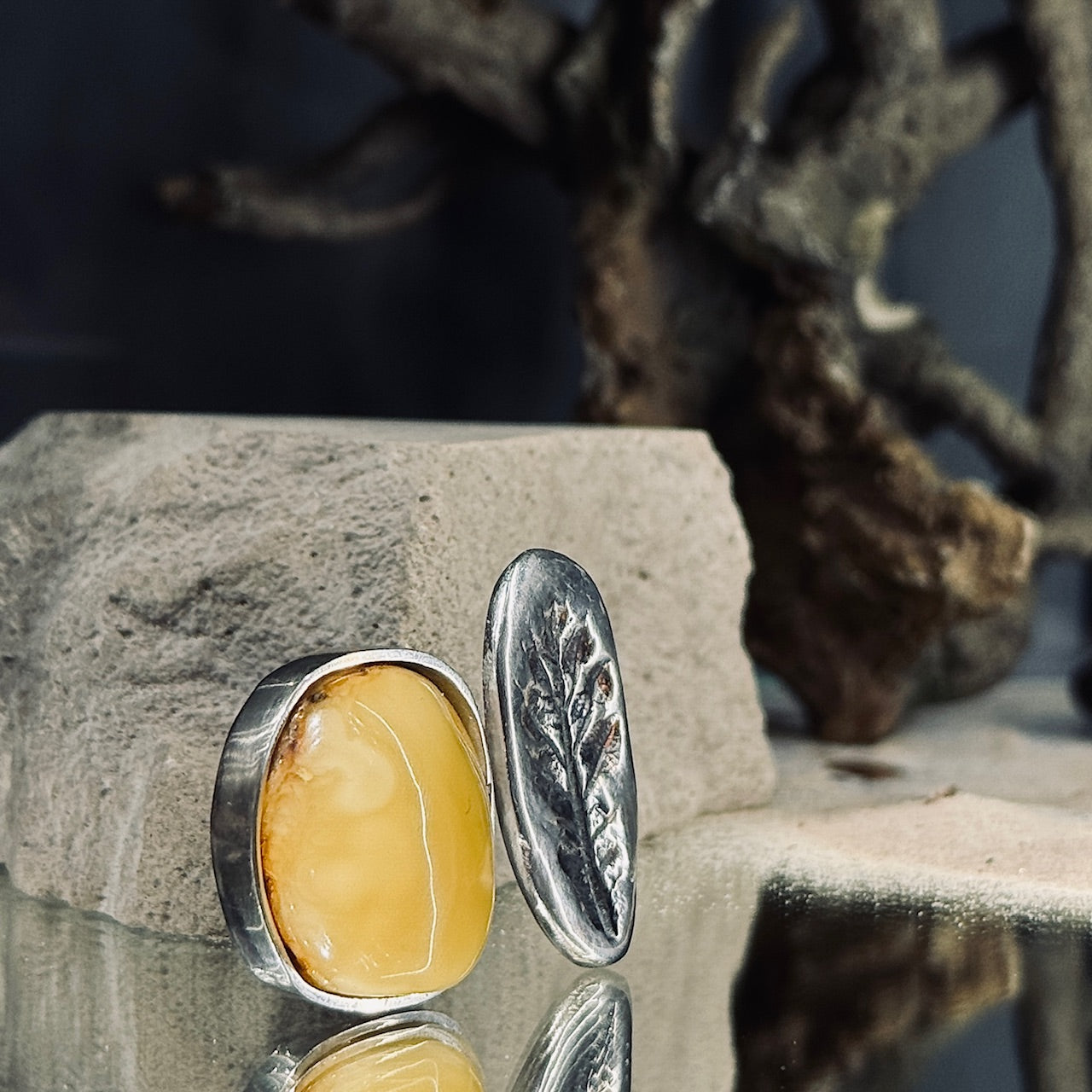 Gredzun dizainā sudrabs un dzintars veido harmonisku dialogu starp dabu un cilvēka roku darbu - viens gredzens izceļ izejmateriāla iekšējo skaistumu, otrs papildināts ar sudraba ozollapas motīvu, kas simbolizē dzīvības ciklu un saikni ar dabu.