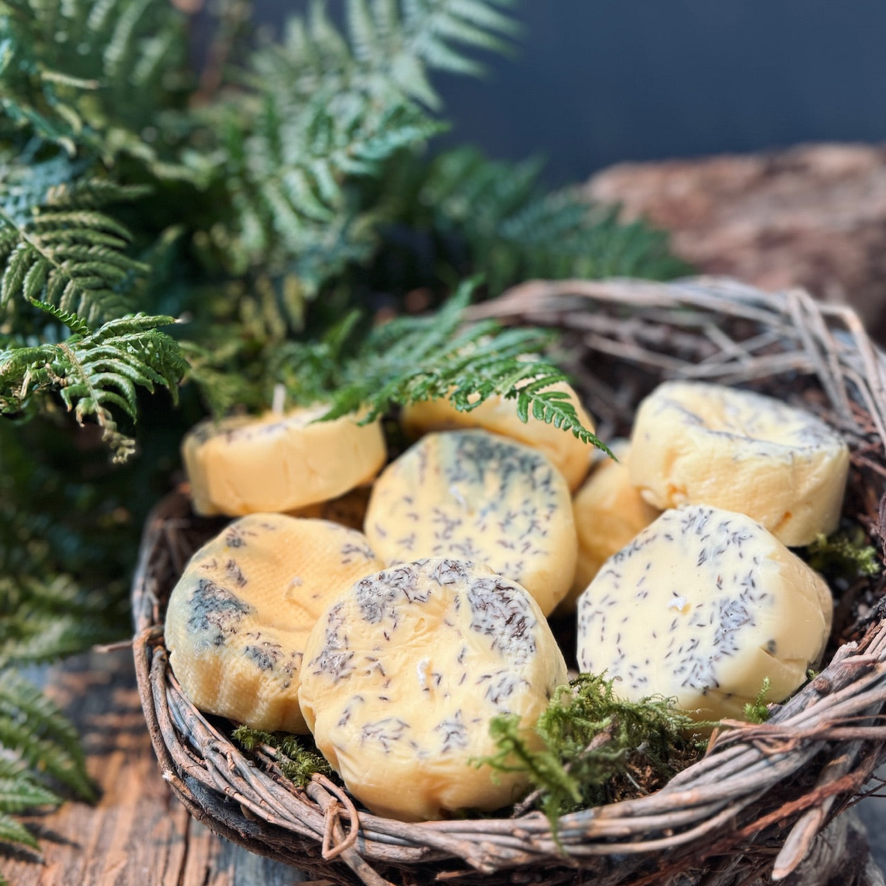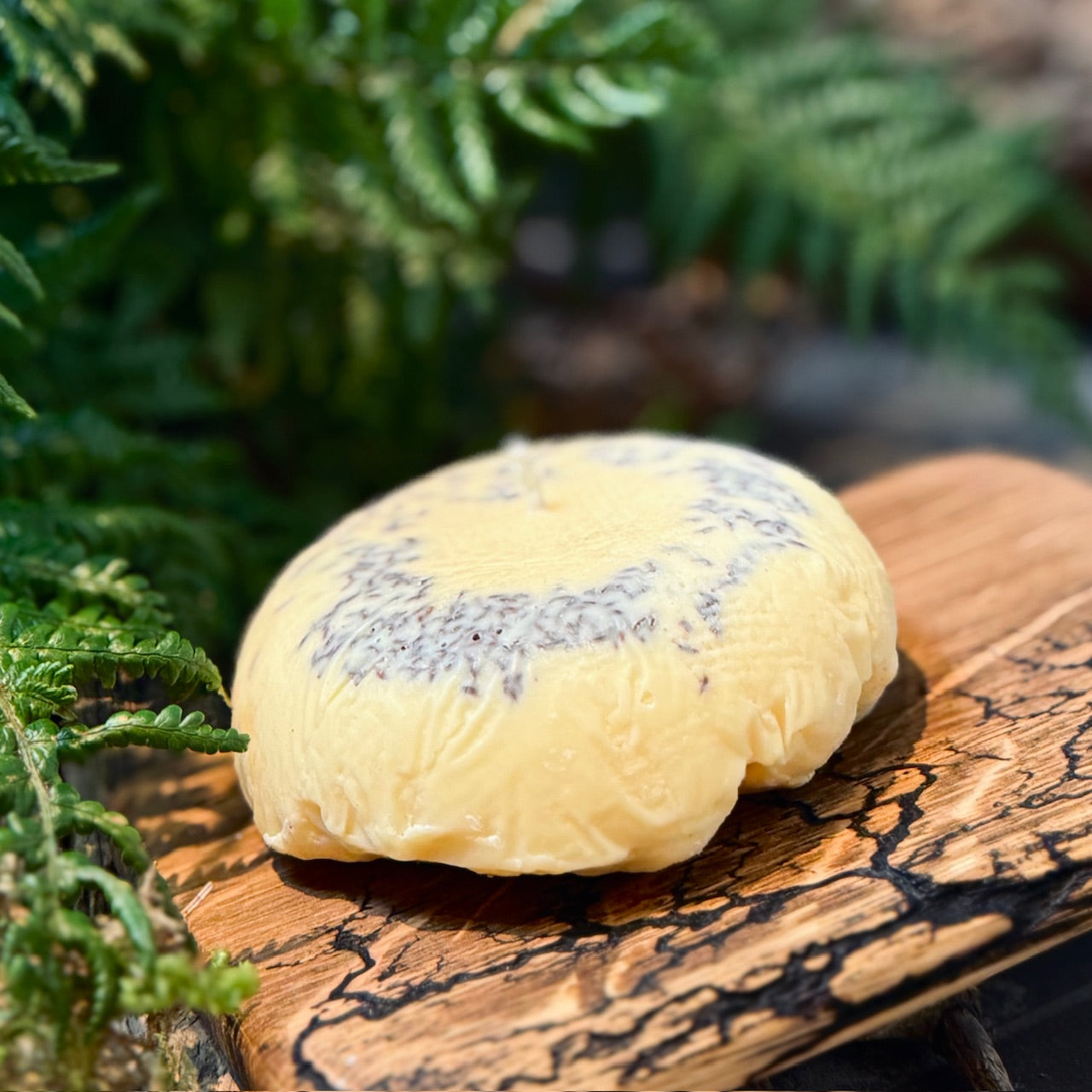 Sojas vaska svece, kas izskatās gluži kā īsts, tradicionāls latviešu Jāņu siera ritulis – ar ķimenēm, dzeltenīgu toni un tradicionālu izskatu.