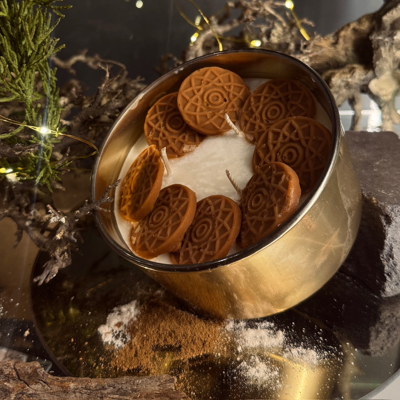 Brīnumu pilna svece, kas katru tās saņēmēju kaut uz mirkli atsauks siltās bērnības atmiņās, kad svētki tika gaidīti nepacietīgāk un apaļās piparkūkas bija neatņemama svētku galda sastāvdaļa. Piparkūkas, kas sabirušas uz kokosriekstu vaska sveces izskatās kā īsts gardums, tomēr tās ir prasmīgi veidotas no sveču vaska radot rotaļīgu akcentu.