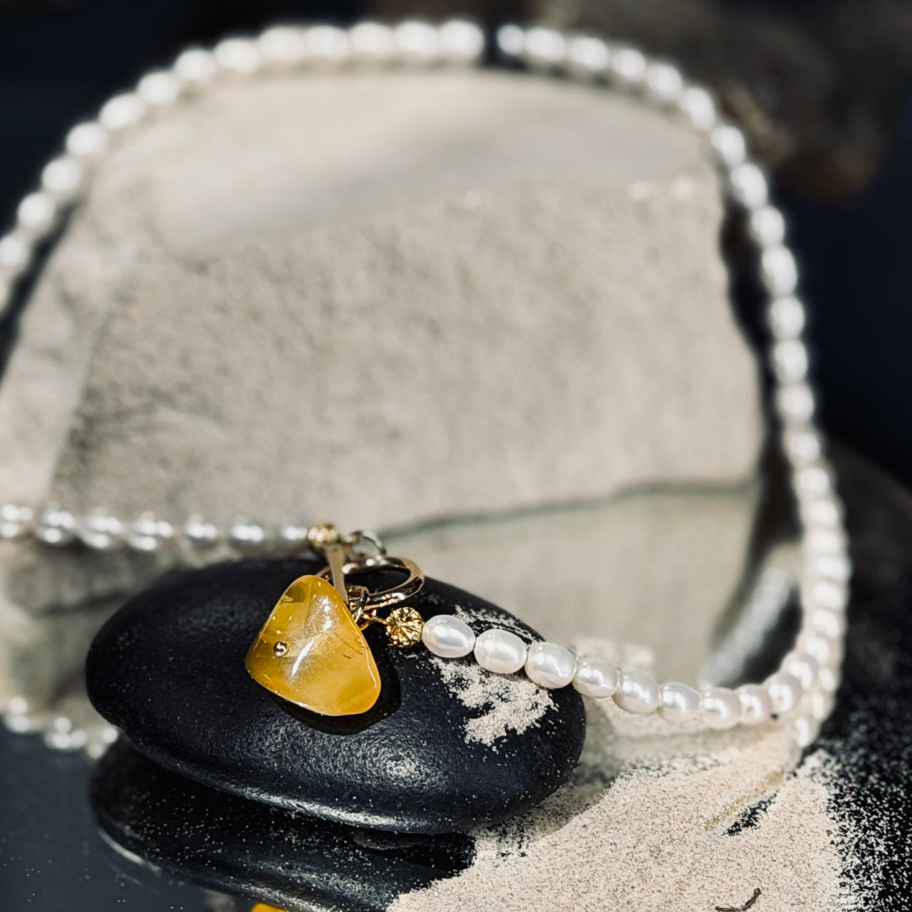 Upes pērles piešķir rotai maigu, dzīvu mirdzumu, savukārt dzintars - saules akmens - ienes siltumu, harmoniju un dabas spēku. Kulona brīvā forma akcentē dzintara patieso dabu un padara katru kaklarotu unikālu.
