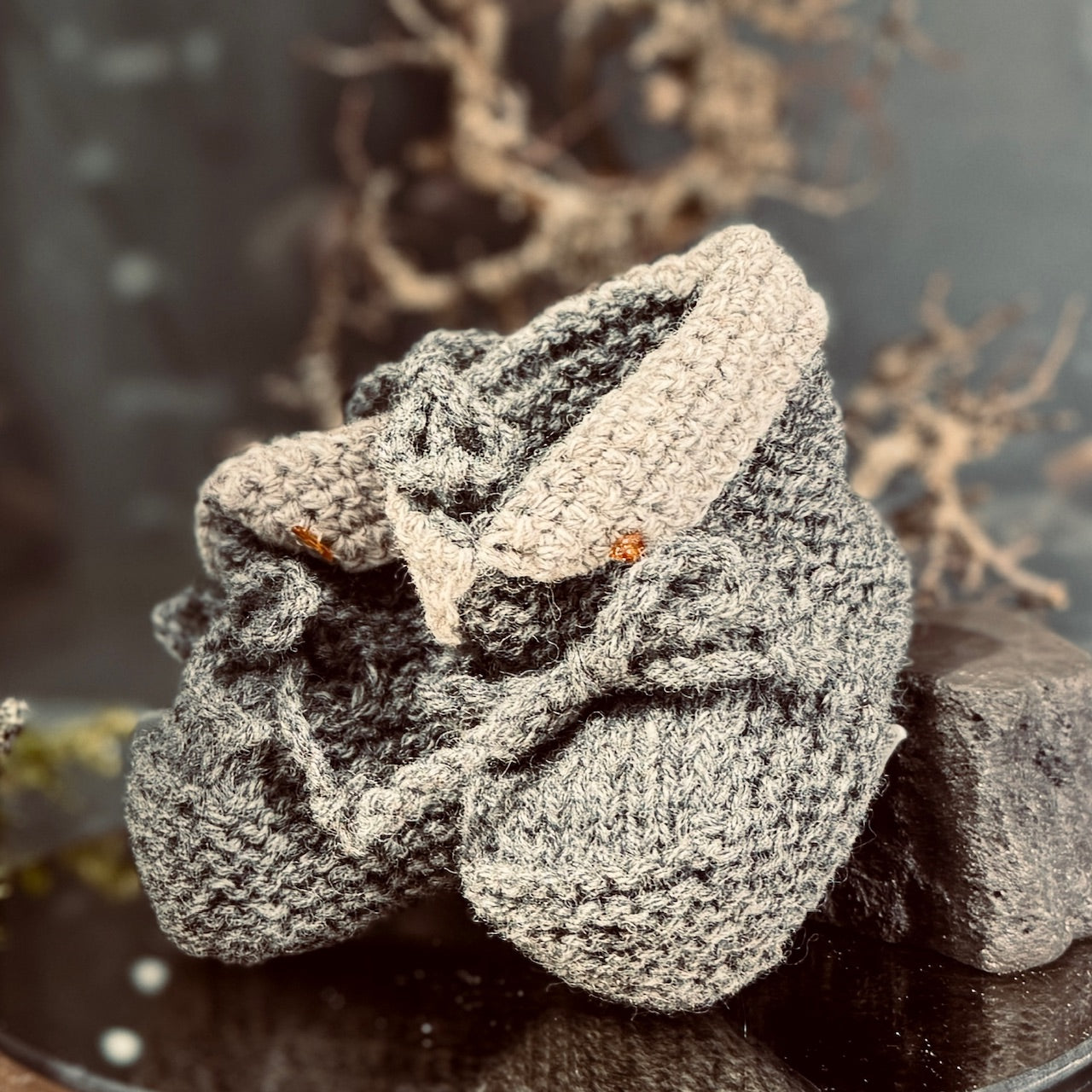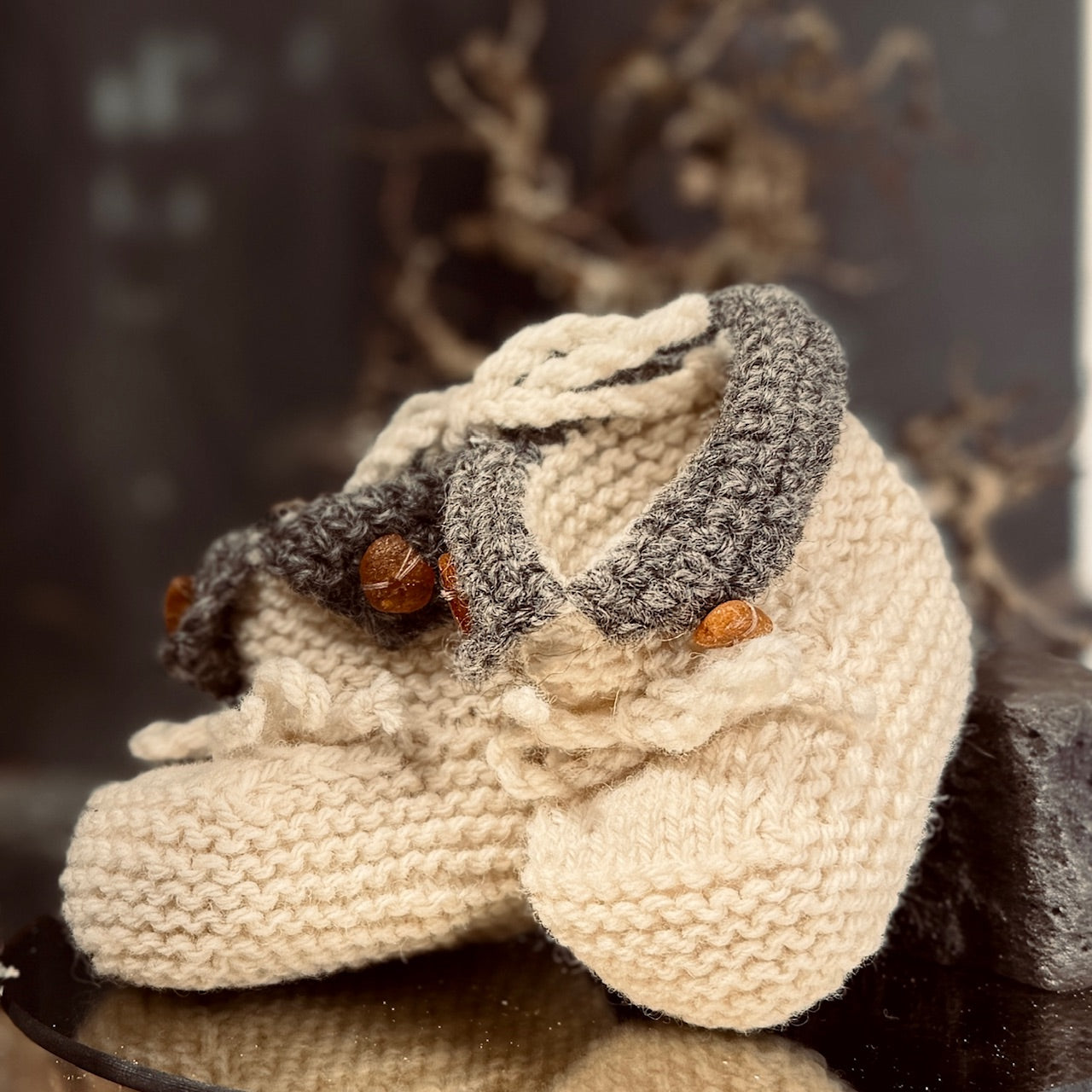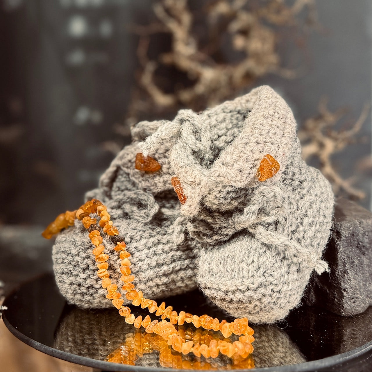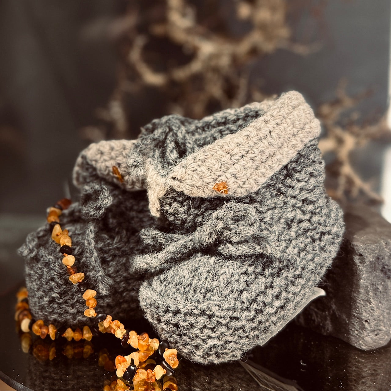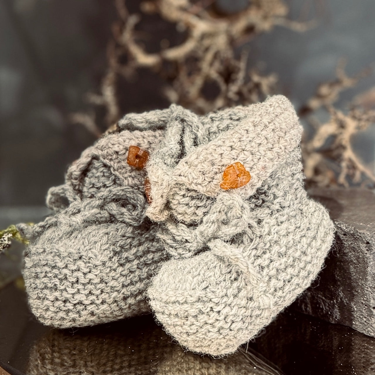 Pelēkbaltais toņu salikums piešķir tiem mājīgu, latvisku raksturu, bet dzintara pērlītes ienes saules gaismu un sargājošu spēku - kā senlatviešu talismans mazulim. Katra nianse radīta ar rūpību, lai mazuļa pirmie apavi būtu gan ērti, gan simboliski nozīmīgi.